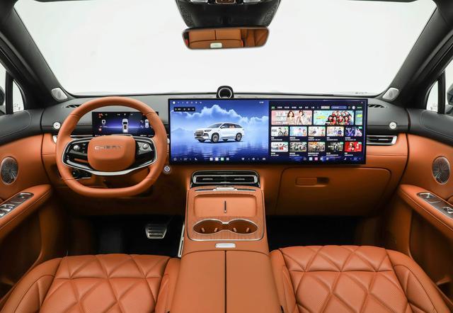 进入车内,全新一代瑞虎9采用了爱马仕橙为主的配色方案,整体采用了大面积Nappa真皮材质铺陈,还配备了5座或7座带有菱形纹路的沙发座椅,车顶加入了豪华麂皮绒材质,还加入了植绒黑色地毯,并使用了魏格曼金属纹理饰板、高级木纹饰板 及 珍珠缝线 等细节点缀,整体软包率超过了82%,车内还配备了多层隔音玻璃、SONY定制音响 和 车内香氛系统,显得更加高级。车内配备了扁平化的窄边框全液晶仪表、换装了更大尺寸的中控与副驾双联屏,带来了最直观的视觉冲击力,基于高通骁龙8295芯片+5G千兆以太网,搭载了雄狮智云3.0版本,拥有AI人脸识别、AI云管家、AI智云互联远程车辆控制和增强型自然语音交互功能。